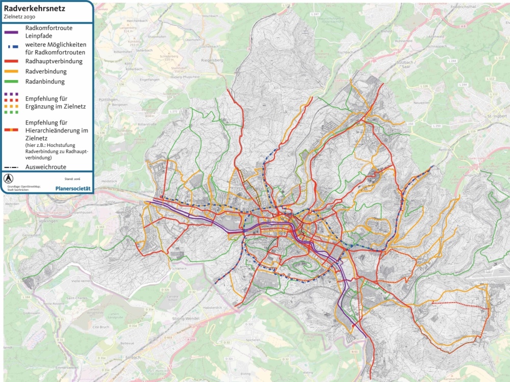 Das Saarbrücker Radverkehrs-Zielnetz, das die Stadtverwaltung zusammen mit dem ADFC Saarbrücken erarbeitet hat, ist bereits engmaschig, hierarchisch abgestuft und besitzt eine hohe Verbindungs- und Erschließungswirkung.
